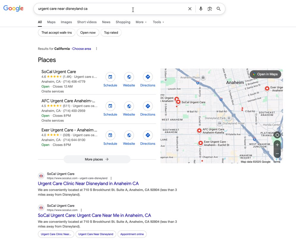 Example 2 – Medical SEO for a patient searching for “urgent care near disneyland”. High quality content is extremely important for high SEO rankings for your urgent care.