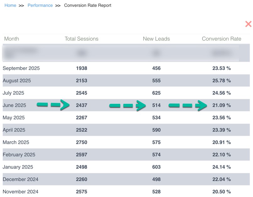 In the example below – Medspa is located in a medium competitive area. In the month of June, using SEO, Google ads, and Meta ads, there are 2437 total patients/clients visited the website. From these, 514 patients/clients took a conversion action , this means that website’s conversion rate is 21.09%.