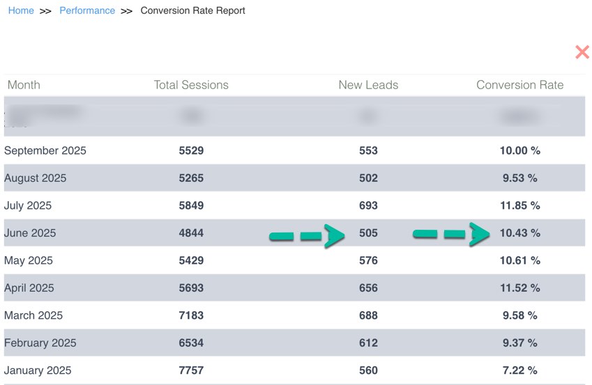 In the example below – Medspa is located in extremely competitive area. In the month of June, using SEO, Google ads, and Meta ads, there are 4844 total patients/clients visited the website. From these, 505 patients took a conversion action , this means that website’s conversion rate is 10.43%.