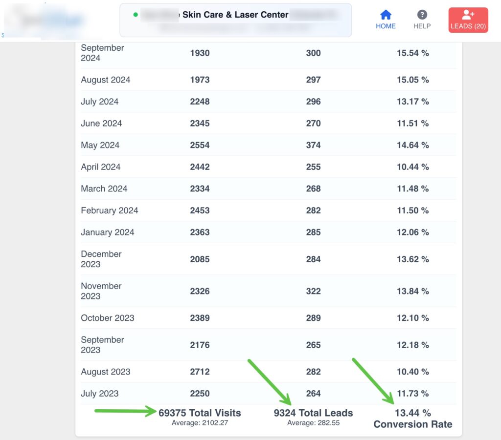 Example 1: High conversion website design — Conversion rates of a medical spa in Florida with stiff competition. Imagine spending Zero dollars on ads, and acquiring on average 282 new patient leads every month (Over the past 24 month average), using PLATINUM Plus service.